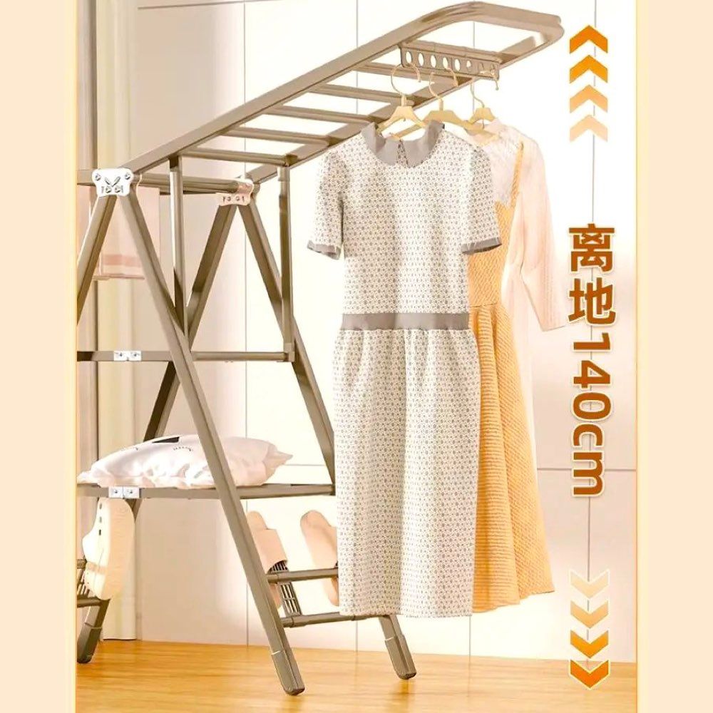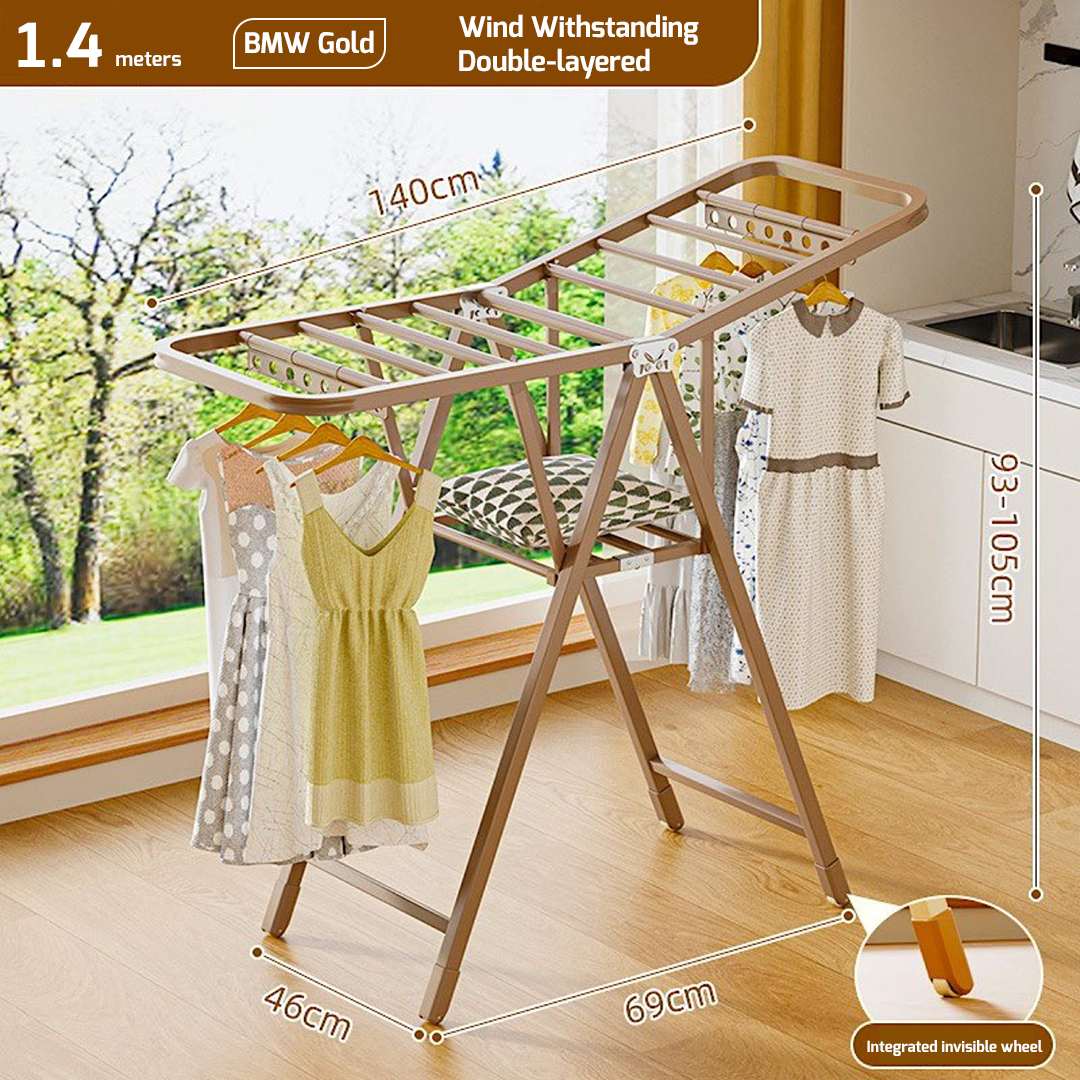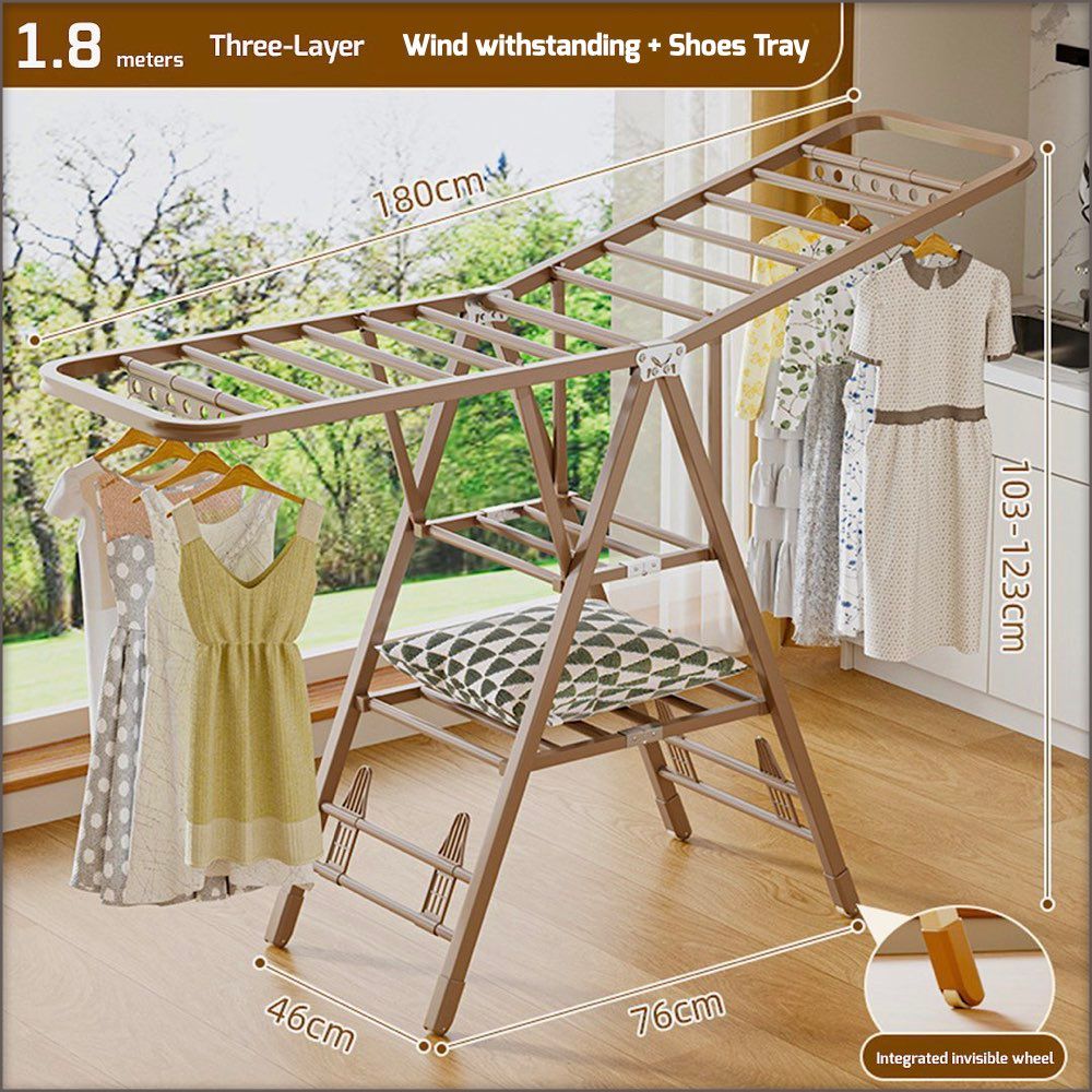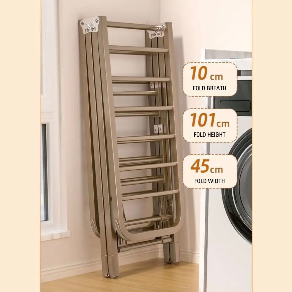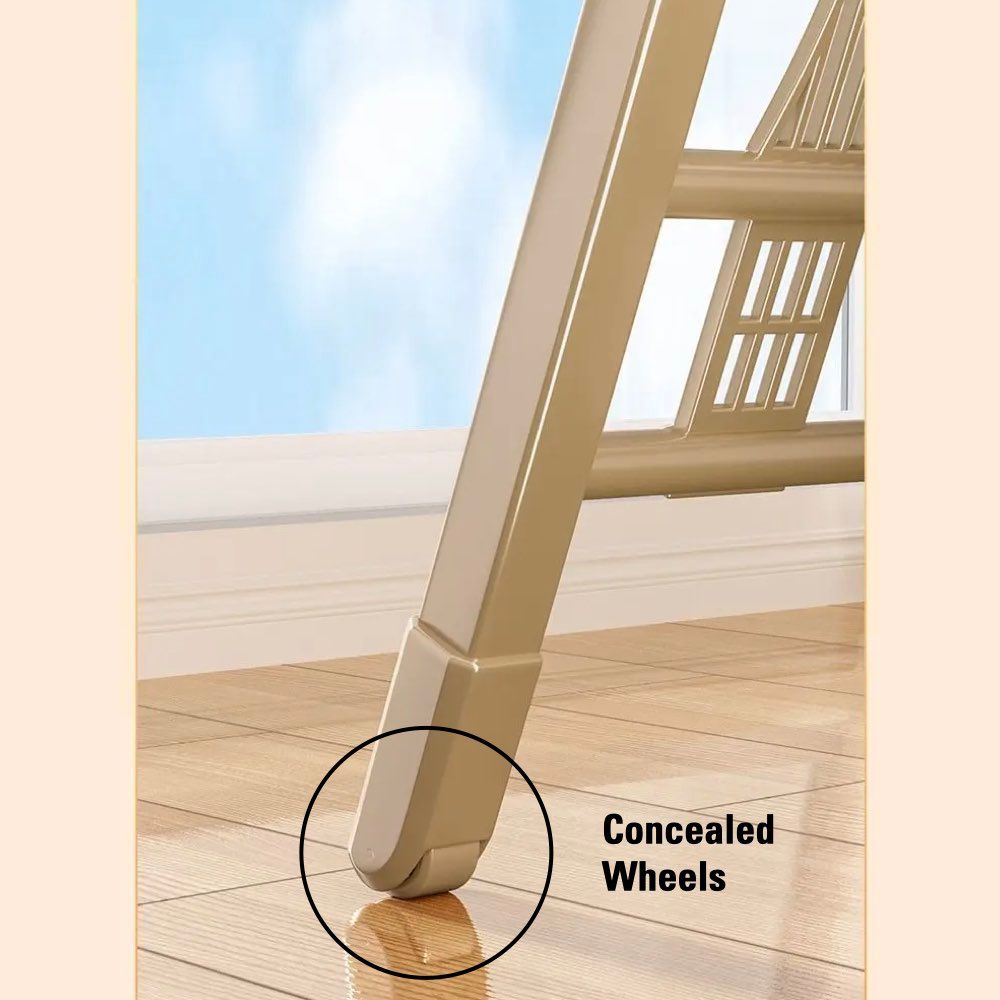 Foldable Floor Standing Clothes Drying Rack with Concealed Wheels.