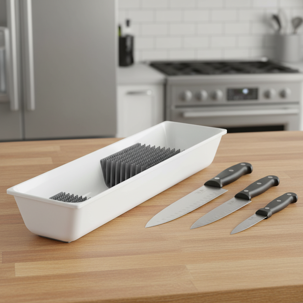 Transform your kitchen drawer with the Knife Tray with Safety Bristles, designed to keep your knives neatly organized and within easy reach. This sleek, white tray not only simplifies your cooking routine but also ensures your knives stay sharp for longer.