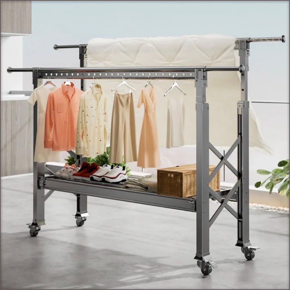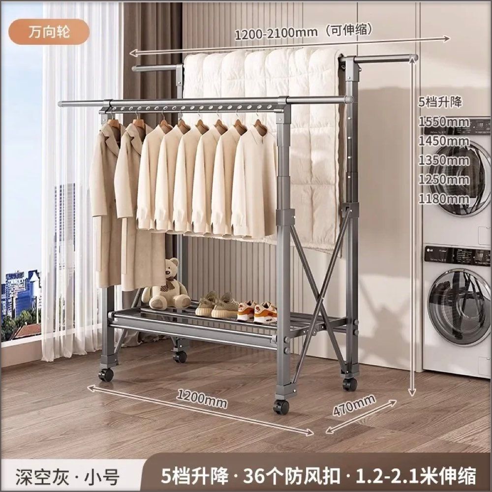 Telescopic Foldable Portable Clothes Hanger Rack with Wheels. Length: 120-200cm. Full Lift 2x Adjustable Height Rails with Holes for Hangers and Bottom Shelf. Color: Dark Grey.